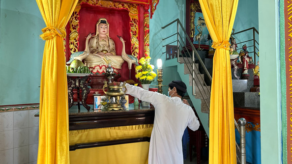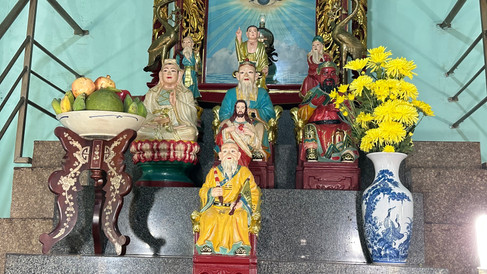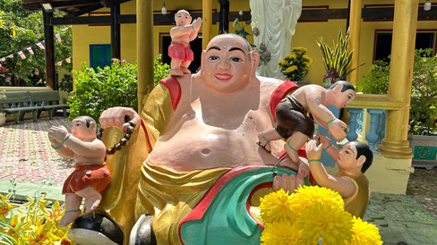 On the day of our trip, it was extremely hot, and we were supposed to ride bikes along the canals. However, instead, we were taken on a couple of vespas into town to visit the Cao Dai Temple, a local Buddhist pagoda. Although it was small, it was beautiful and served as the village's focal point. We felt very honored to walk through it, especially since they were about to hold a funeral, but they allowed us to spend some time there. We also visited a local market in another village. It was definitely a place for locals only, but everyone was friendly and welcoming to the Americans experiencing the bustling scene.